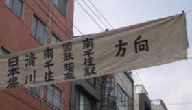 「日本堤 清川 南千住 国鉄 地下鉄 南千住駅 方向」進むべき方向は合っているが、「国鉄」って何年前。Wikipediaで調べると1987年にJRになったらしい。すでに22年経過している。このバナーは22年以上経過して大事に扱われて使用されているのだろうか。