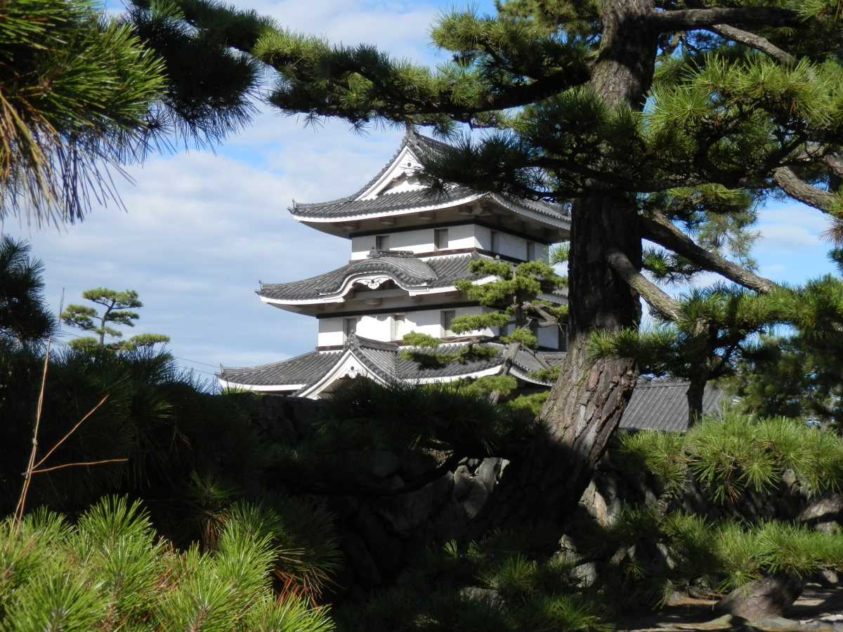 それに乗って、まずは「玉藻公園」に行く。お堀に海水を取り入れていて、水門を塩の香りがする水が流れ込んでいる。高松城は天守閣を作る準備をしているようで「鯛願城就」の幟が多く立てられている。やはり中心的な天守閣が欲しくなるのだろうか。近代的な公園でも中心に噴水を作ったりするのと似ているかな。(写真をクリックすると大きな画像で見られます。)