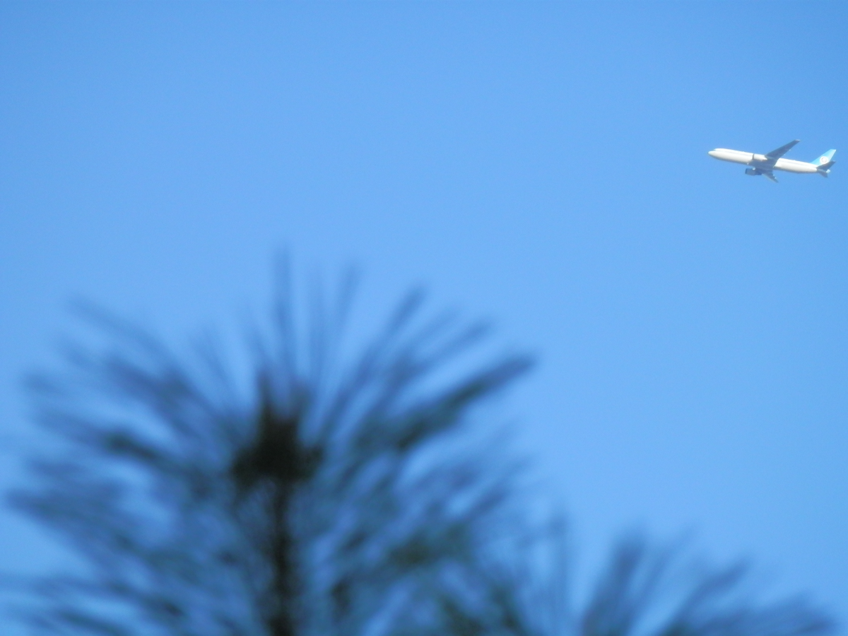 空港で見た「モヒカンジェット」が東京へ戻るのか、頭上を飛んでいった。(写真をクリックすると大きな画像で見られます。)