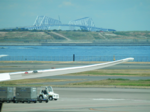 羽田の待合室から遠くに見えるのは「東京ゲートブリッジ」。ニュースでは見ているが、少し青いガラス越しで実物は初めて。(写真をクリックすると大きな画像で見られます。)
