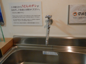 高松空港はそれほど大きい建物ではないので一周してみる。空港内の「空の駅かがわ」にうどんの出汁が蛇口から出るようにしているとの記事は調べておいたので、そこに行ってみる。空港に到着した人はすぐにバスで市内などに向かうのだろうか、空いている。確かに蛇口のそばに紙コップが筒状に設置してあり試飲ができるようになっている。