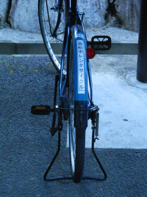 ホテル内で一服してから、高松駅前広場地下レンタサイクルポートでレンタサイクルを借りる。高松市内は歩道が広く自転車が走りやすい環境を整えている。24時間100円で借りられる。市内7ヶ所のレンタサイクルポートに乗り捨て可能になっている。ママチャリ風な自転車だが、市内を歩き回るよりは便利である。