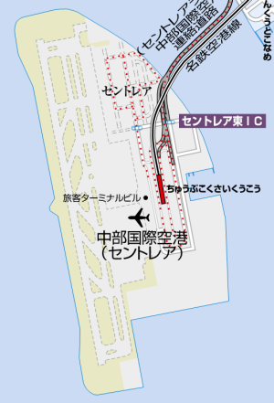 帰りの便も窓際に席を予約しておいた。雲はあるが天気も良いので地上がある程度見える。特徴のある地形であれば窓からでも確認できるだろうと思いながら、飛んでる時間のほとんどを窓の外を見たり、写真を撮ったり。はっきりと確認できる中部国際空港(セントレア)が地図と同じように(?)見えた。(地図をクリックすると大きな画像で見られます。)