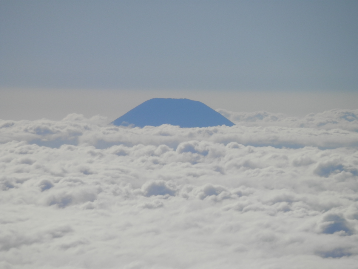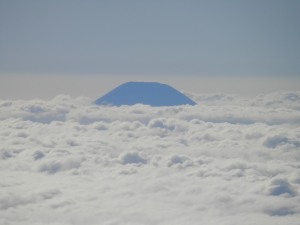 少し遠くに鳥海山(と思われる?)が雲の上にポッカリ頭を出している。(写真をクリックすると大きな画像で見られます。)