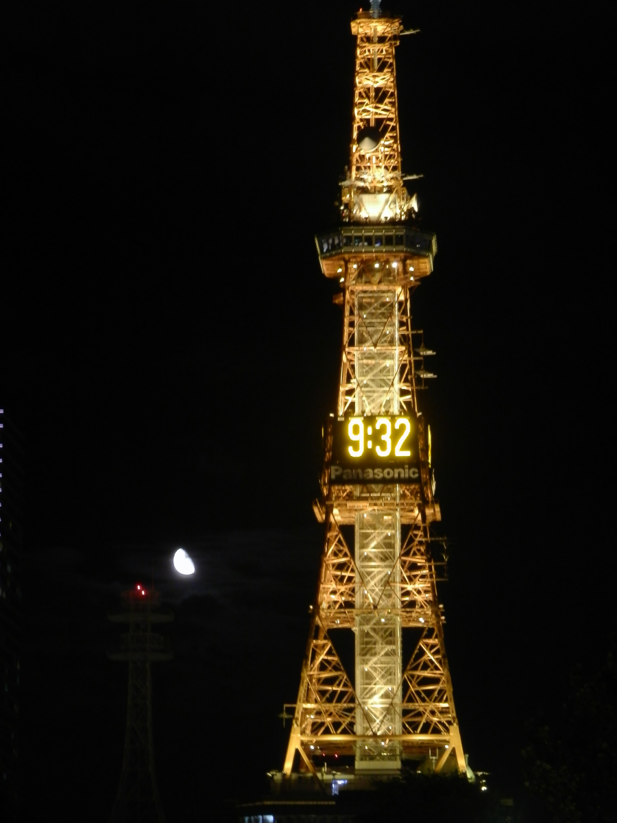 札幌のテレビ塔と月。写真を撮り始めた時には綺麗なイルミネーションに輝いていたのだが、カメラの手振れ補正も効かないほどの写真になっていたので、何度も撮り直していたらイルミネーションが消えて、ライトアップになってしまった。唯一、月とテレビ塔が静止して撮れた写真。(写真をクリックすると大きな画像で見られます。)