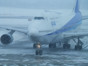 新千歳のフードコートの窓から飛行機を眺めたり、写真を撮ったりして搭乗時間まであちこち。B747が近くに来た。この飛行機にはよく乗った。形も好きだし、安定感を感じる。吹雪の中だが撮影する。