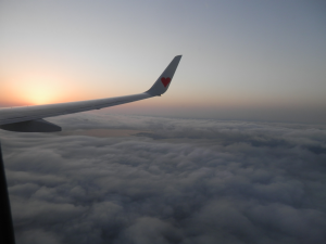搭乗したSkyMarkの機番はJA737R。これは羽田から鹿児島に行った時に乗った飛行機だ。夕焼けを見ながら雲上を羽田に向かう。