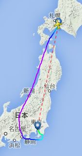 往路はエアードゥーのB767-381。機体番号はJA601A。フライト番号はADO29便。座席は38A。上手く窓側の座席が取得できた。プッシュバックから着地までは、ほぼスケジュール通りで、誤差は数分で早いくらいだった。窓側に座ると窓外を見ている時間が長くなる。そしていつものGPSロガー(GT-730FL-S)も同乗している。滑走路は羽田空港の「16L」。それで確認すると予定航空路を飛んでいる。