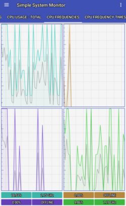 モニタ内容はCPUの使用率(各コア毎、合計)、CPU使用周波数、CPU使用周波数毎の使用率、負荷平均、GPU使用率、RAM転送数、ネットワーク転送数、DISK(内蔵ストレージ、SDカード)使用率、アクティブプロセス、温度域、バッテリー温度などである。
