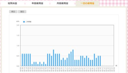 (5) 一日の使用量。30分毎の電気使用量の棒グラフ。その時点なのか、30分の平均値なのか、おそらく後者。kWh表示。これが見える化に相応しいグラフだ。30分毎の表示だが、30分終了したらすぐに表示ではなく、約1時間30分後に表示される。