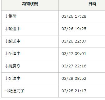 その翌日にまたステータスが「配達中」に変更された。そのような場合には昨日配達できなかった荷物を先に配達するのかなと思っていたが、そうではなかった。午前中にも、午後になっても、夕方になっても届かない。どういう事。これでは今日も「持戻り」かなと思っていたら21時過ぎにピンポン。同じ荷物を同じ営業所に2日間も「持戻り」はしないか。その時の追跡結果がこれ。