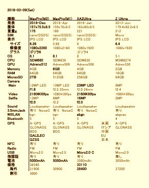そこで、「Zenfone Max Pro (M1)(台湾版)」「Zenfone Max Pro (M2)(日本版)」「Xperia XA2 Ultra(ワールドワイド版)」を並べて一覧表にしてみた。その中で勝っている部分を太字で表示する。