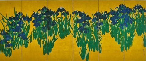 燕子花だけを切り取り、背景を描写せず、ズームアップした写真から燕子花だけを浮き立たせた表現方法。琳派と呼ばれている絵画にはこのような表現方法が多いのだろうか。