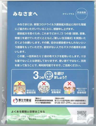 4月1日に配布を発表したアベノマスクが、松戸市在住の我が家にも本日(6月17日)投函されていた。