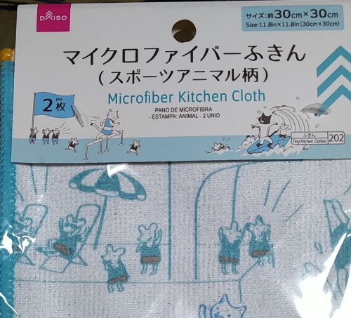 それで購入したのが「マイクロファイバーふきん」2枚組。大きさは30cmx30cm。そんなに厚くないので嵩張らないような気がする。