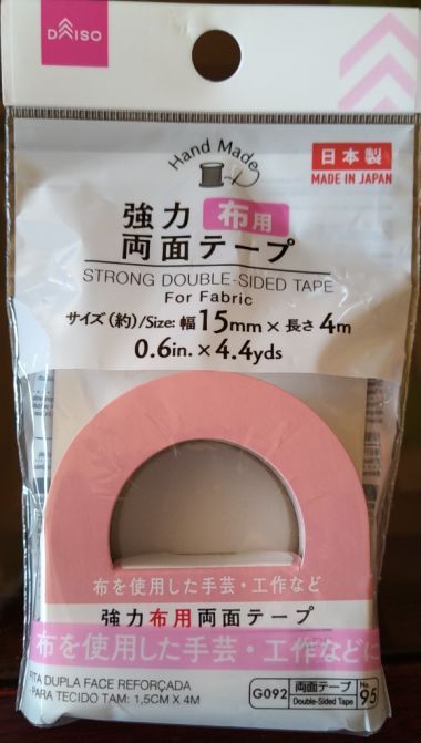 短く切った両面テープを目立たない場所テストしてみた。それらの中で、コレッと決めたのだが、結局はダイソーの「強力布用両面テープ」。