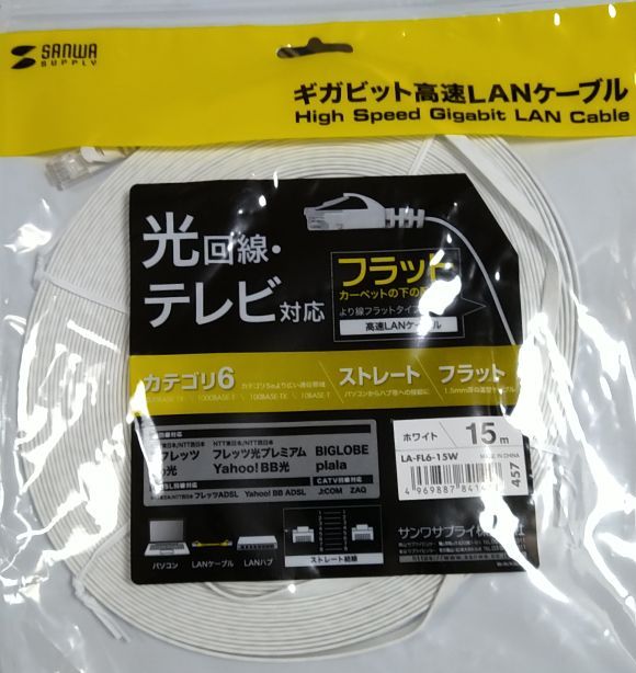 LANケーブルはフラットで、ギガビットに対応した物を購入する。Cat6で15m。