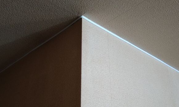 最上部の写真は天井と壁の境目を這わせて貼付した状態のLANケーブル。白いLANケーブルだが、カメラのホワイトバランス調整が悪いからか、青っぽく写っている。