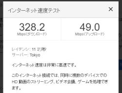回線速度を測る。公称値は下り200Mbps、上り100Mbpsであるが、調子の良い時には下りのスピードが300Mbpsを超える時もある、しかし上りが異様に遅い。VDSL時よりも遅い。