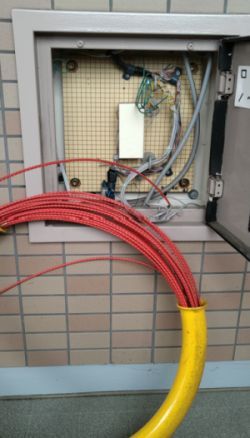 その光ケーブルを縦方向の管に通し、1FにあるMDFに行ったのだろう(その作業は見ていない)。