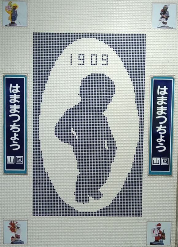 南口近辺に小便小僧のタイル画が設置されている。四隅には季節ごとの衣装を着せられた写真と、浜松町駅は1909年開業ですよとアピールしている。約110年経過。
