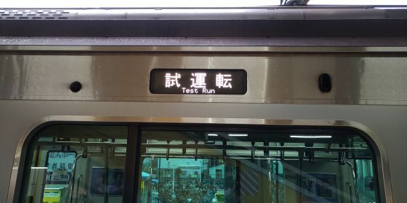 なんだろうと思い見たら、行き先表示に「試運転 Test Run」と表示されていた。