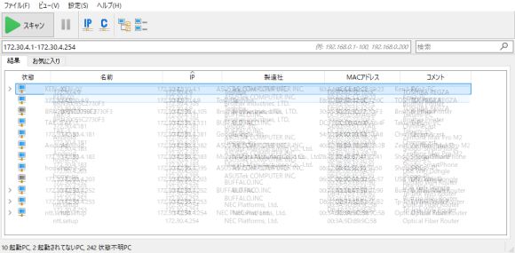 一度IPアドレス範囲を指定すると、次からは「スキャン」ボタンをクリックするのみ。