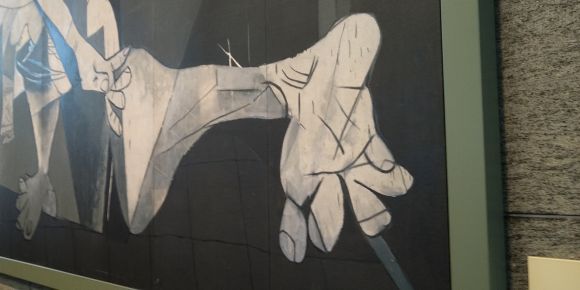 実物はスペインのソフィア王妃芸術センターに展示されているらしい。パリ万博のスペイン館の壁画を依頼され、ゲルニカの惨状を見てはいないが、ドイツの無差別爆撃の悲惨さ、恐ろしさを描いたらしい。