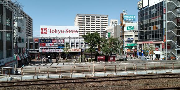 「Tokyu Store」の大きな看板と、火災時に延焼を食い止める防火ビルではないかなと思われる背の高いビル。その先には水元公園がある。一回だけ訪問した。