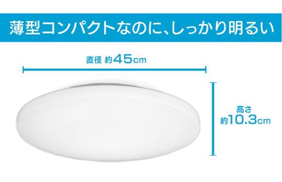 6畳間なので、そんなに大きくなく、調光であれば調色は必要ない。膨らんで厚いシーリングライトではなく、平べったい感じ。リモコンが付属する。