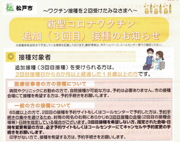 一・二回目には自分で空き具合を確認して、予約を入れる仕組みだったが、TVなどでは高齢者が予約の方法・電話が繋がらないなどで、接種の予約が出来ない様子が報じられていたので、それへの反省からか、市役所側で指定する方法が採られたのだと思われる。PDCAを回しているなと感じられた。