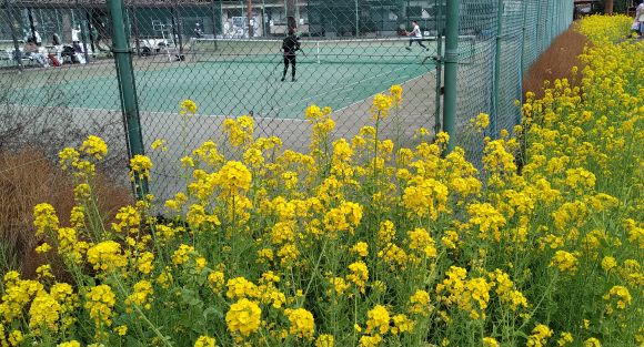 ウィークデーだが、テニスに興じる人達の傍には菜の花が咲き誇っている。