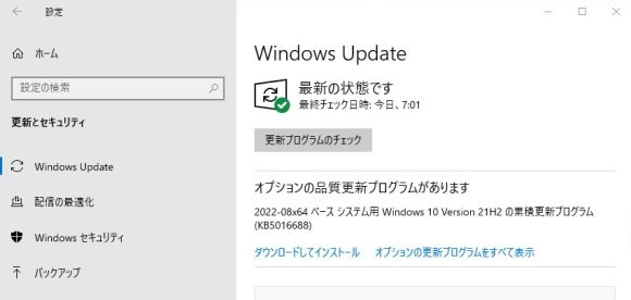 それで安心して、Windows10が最新の状態かを確認するのに「更新とセキュリティ」を確認すると「オプションの更新プログラム」に「KB5016688」が表示されていた。「21H2」にはなっているので「オプション」は入れなくても大丈夫なのだが、安心・開放感からか、「最新にしましょう」とインストールして、再起動。