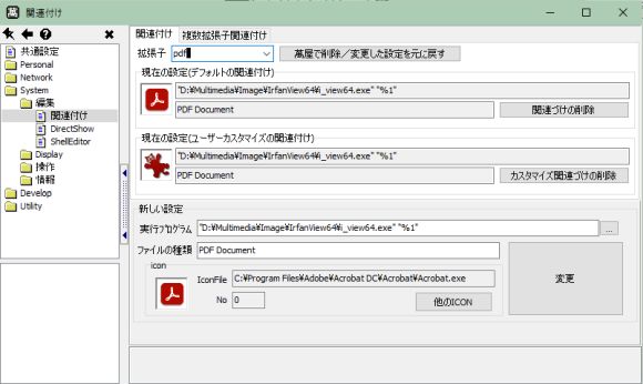 「萬屋」を「管理者として実行」(私の実行したい内容を選択すると「管理者として実行」を選択しなければならない)→「System」→「編集」→「関連付け」→「拡張子」に「pdf」と入力→「現在の設定(ディフォルトの関連付け)の実行ファイルの場所をコピー →「現在の設定(ユーザーカスタマイズの関連付け)に今コピーした実行ファイルの場所を貼り付け → 「新しい設定」の「他のICON」をクリック→アイコンの設定が終了したら →「変更」をクリック。