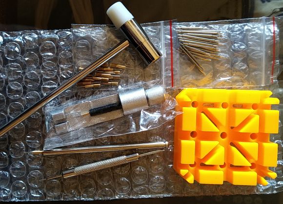 時計ベルト調整器具は持っていたのだが、どこにしまい込んだか分からなくなってしまった。Amazonのレビューを読んでみると、100均の220円の調整器具でも対応できるようだが、この際安い「時計ベルト調整器具セット」を購入しておいても良いかなと考え、それも購入した。