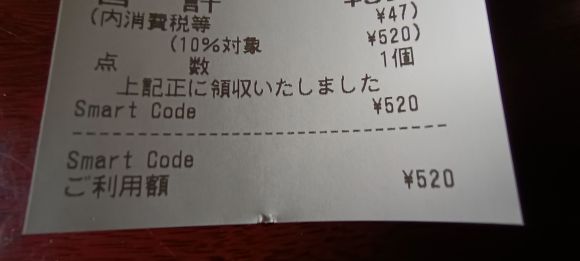 見慣れたQuicPay利用時に印刷されるレシートに比べて、内容が簡単に「Smart Code」と記載されているだけになっている。
