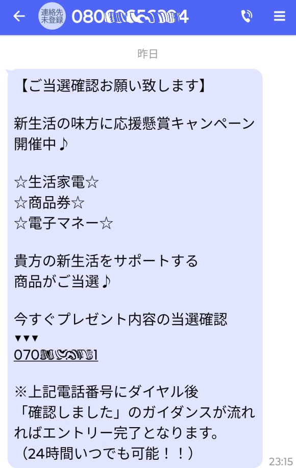 当選連絡なのに、電話すると「エントリー完了」となる不思議さ。そこから詐欺に引っかかるように「エントリー」するということなのか。
