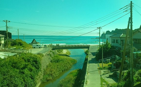 外房線とは言うが、線名の意味するような景色が現れるのは、御宿から線路の向こうに海が見えてくる。上掲の写真は列車の窓ガラス越しで、窓ガラスに色がついているので青っぽい色合いで写っている。