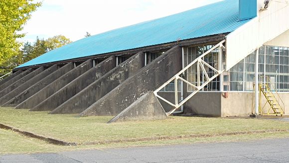その昔(昭和20年頃)使用されていた飛行機格納庫。ゴシック建築の教会で使用されていた「フライイング・バットレス」のような天井からの重みを横・地面に逃がすような工法の建築物。飛行機格納庫があるということはこの近くに飛行場があったと言うことかと、ネットで調べると「松飛台」の地名は「松戸飛行場」から名付けられたらしい。