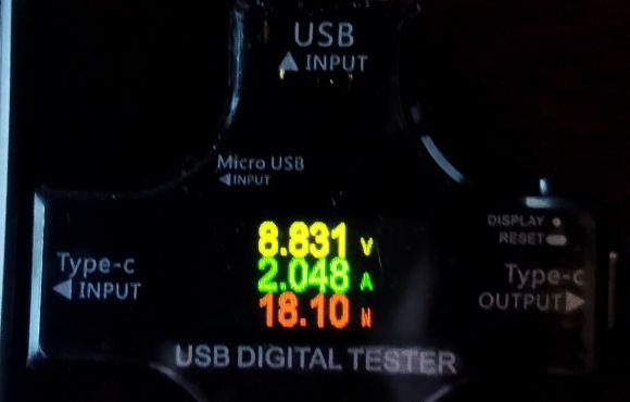 9V弱、2A強、18W程度で充電している。30Wフルフルには使用しないようだ。USB-Cは充電器と充電される機器が会話しながら充電しているらしいので、スマホは「この程度の電圧、電流で充電して下さい」と言っているのだろう。