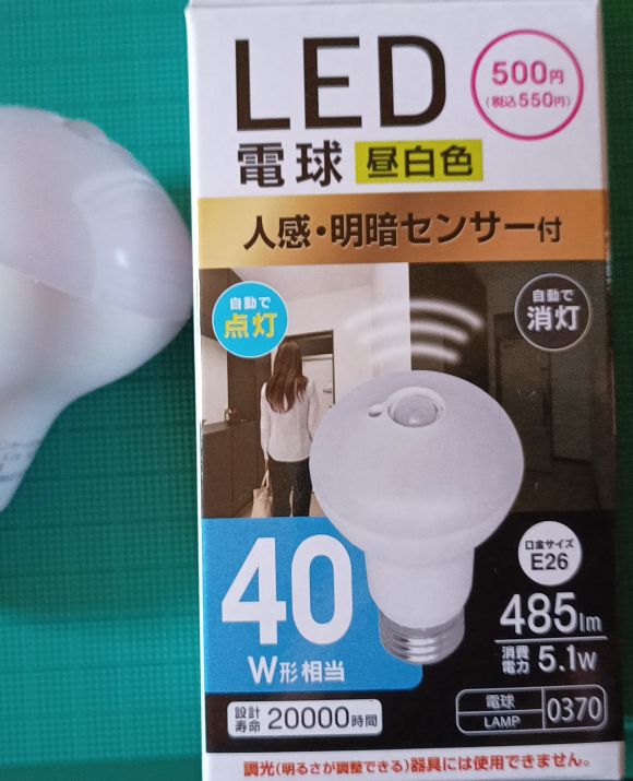 ダイソーでセンサー付LEDが発売されているのはネット記事で確認していた。大きさや口金サイズが、我が家の洗濯機置場の口金サイズに合うのかを現物でE26と印刷されているで購入。価格は550円で、10年間で同様機能の電球が1/3の価格になっている。点灯時間は2分間。この程度で良いと思われる。設計寿命(定格寿命)が40,000時間と20,000時間で半分になっているが、3回購入すると同価格帯で、合計寿命が1.5倍になる。計算上もやはりダイソーの電球が安い。