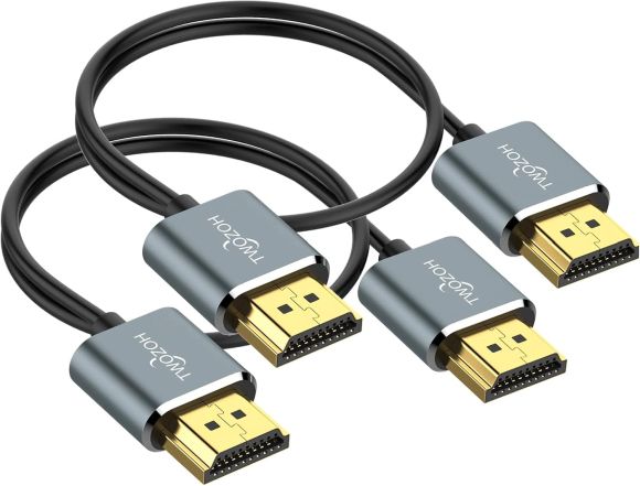 それで、HDMIケーブルが2本必要となるが、そんな需要を当て込んでいるような、机上で接続しようとしているので、短めの柔らかい細いケーブル2本をセットで販売している商品を見つけた。