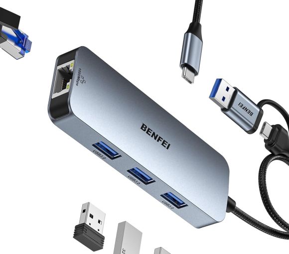 最近のノートPCにはLANポートが無い機種もある。そのような機種をお持ちのお客様にお伺いした時にはWiFiのスピードではなく、有線LANでのスピードが欲しい場合がある。そんな時に、RJ45-USB変換器があればなと思うのだが、今回購入したUSBハブではLANポートが付属した機種を購入した。