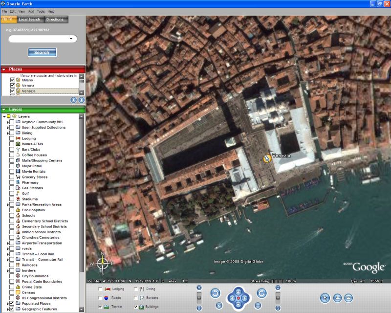 ◎2005年初頭に妻がイタリア旅行に行ってきたので、その立ち寄った街を順番に「MyPlace」に登録して、それを「PlayTour」で表示させると、まるで自家用機でイタリア国内を周遊しているようである。近くの街へ移動するときは、地表からあまりJumpしないが遠くの都市への移動は高くJumpする。このトレース感がたまらない。